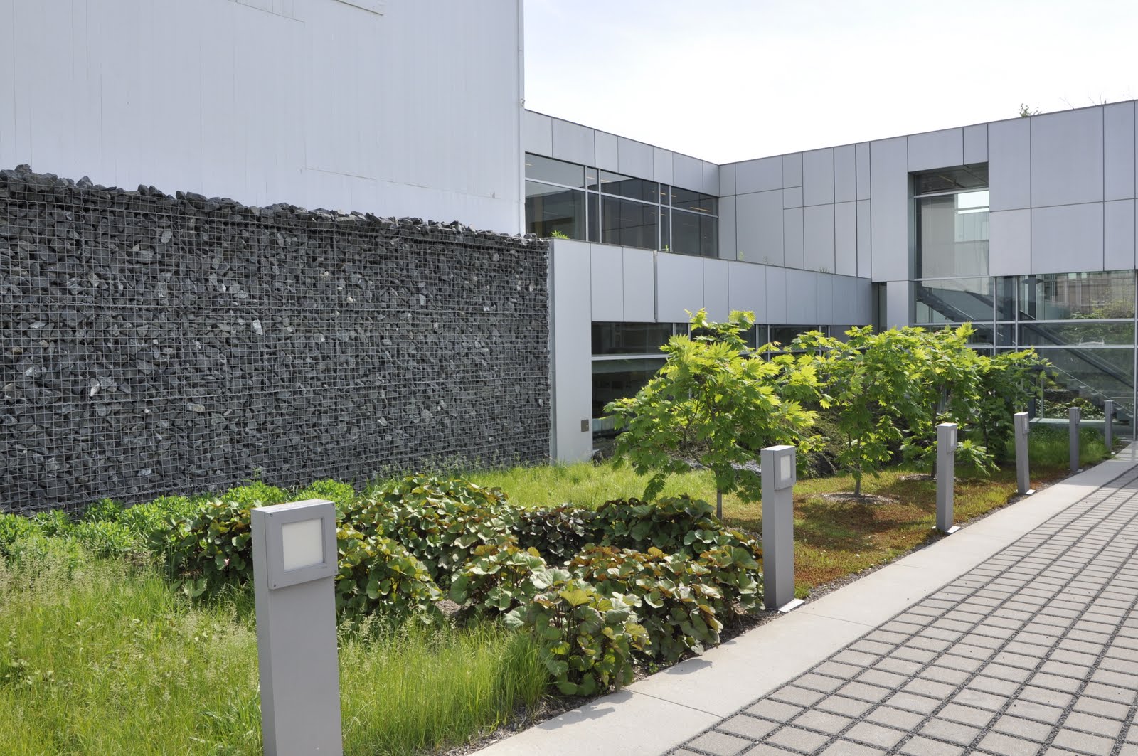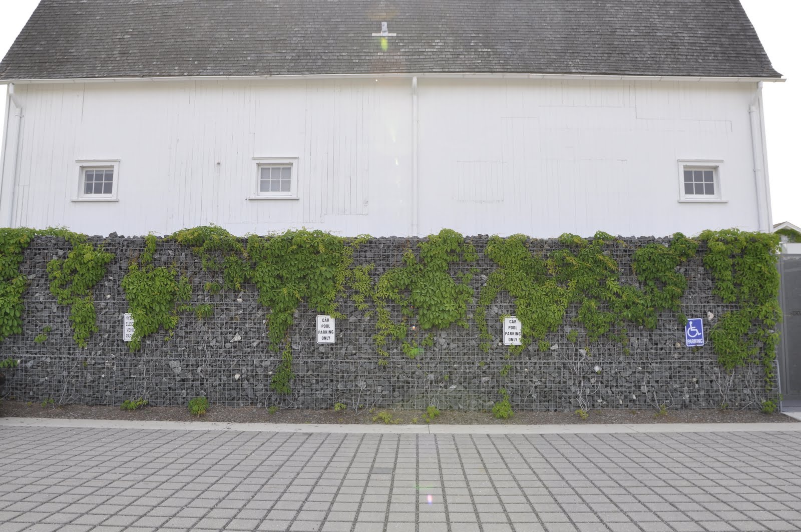 Showcase of the new building mixed with the historic red barns. The cages filled with stone act as retaining walls. These are often used on shore lines to stop eroding. |