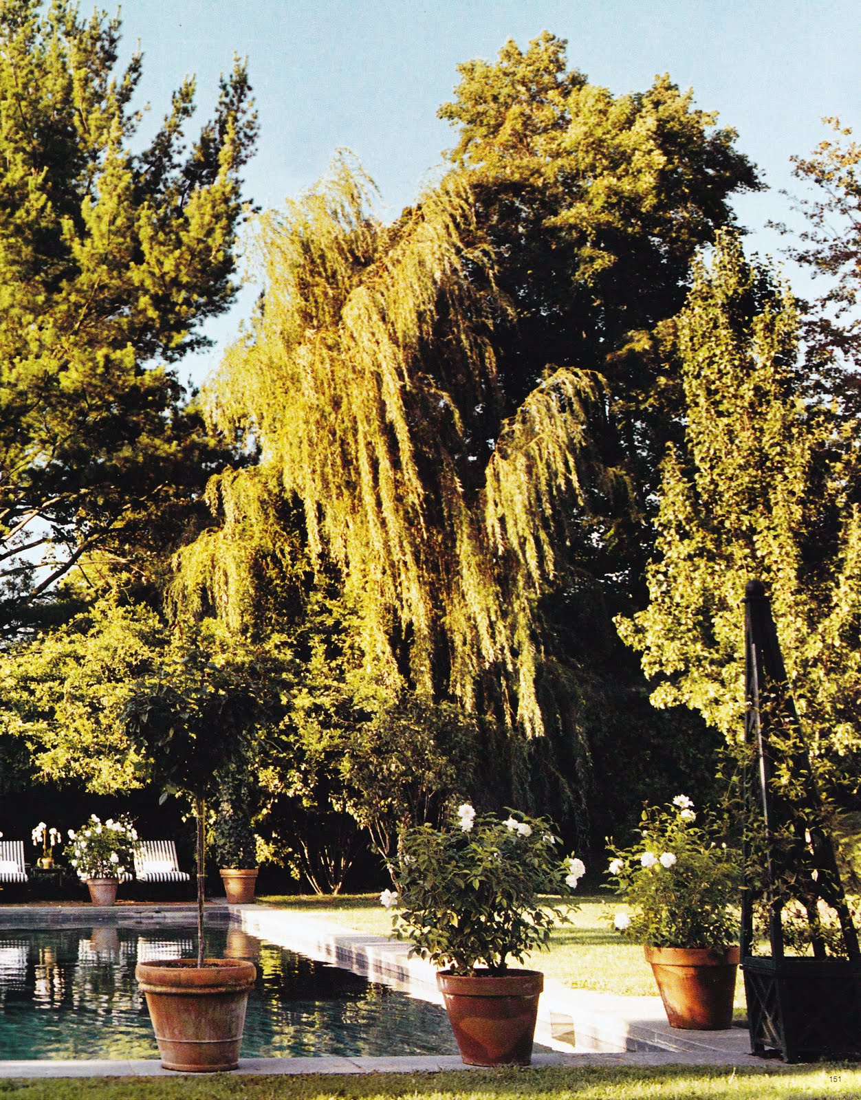 | The rose bushes in terracotta containers help to define the pool area and the large weeping trees beyond provide much needed shade. Image from Elle Decor June 2005 |