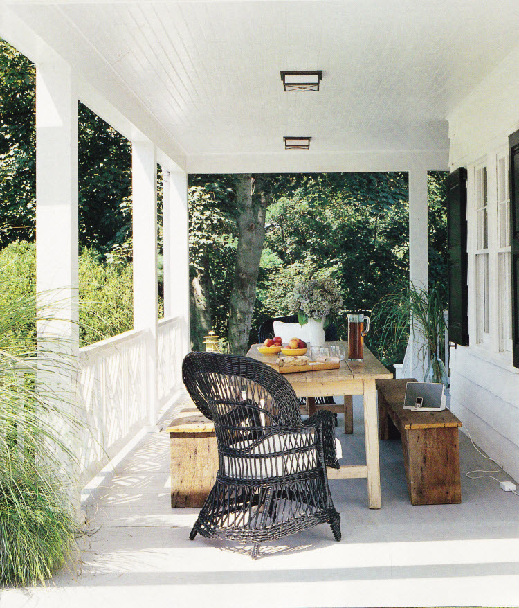 Porches are excellent places for outdoor dining. The rustic benches would be perfect on the rough natural stone pavers in the first image as well as seen hear. Image from Elle Decor June 2009 |