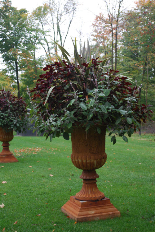 2010 While this year we used silver gray plants, last year we used dramatic dark plants. This photo was taken later in the season when the plants had more time to mature. We used a Pink Stripe Phormium, Silver Shield Plectranthus, and a burgundy Coleus.
