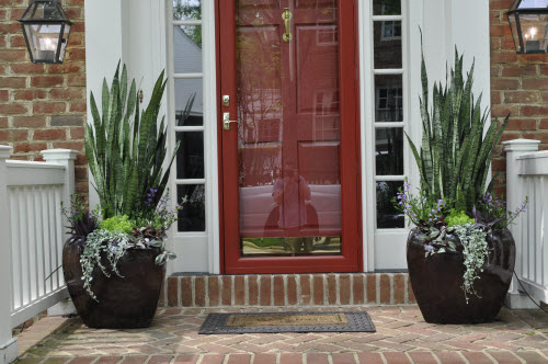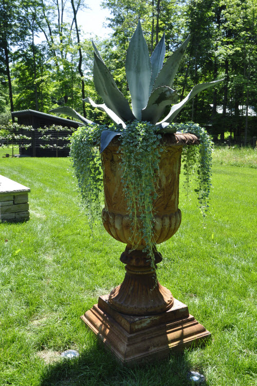 Spring 2011 This year we did large agave with trailing Silver Falls, Dichordra in this client’s urns. These containers are very large, so every year we look for plants that will play off that height. We will take the agave inside for the winter so they can be used again, maybe with a different trailer or in a different container. |