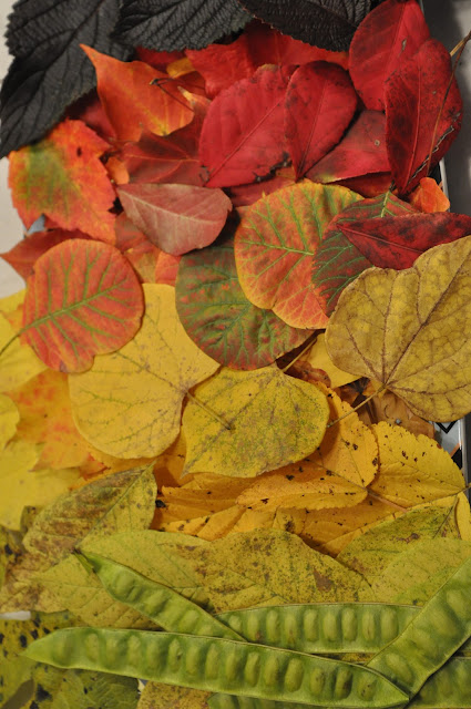 After dinner tonight we took our nightly walk through our neighborhood with James. Along the walk James collected different colored leaves that we saw and then completed the search around our own yard. Here is the the collection of leaves James found (with some help from Dad and Mom).