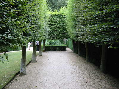 From this photo you can really see the structure of the branches creating the unified green wall. This very tall allee of pleached trees is at Arley Hall in England.